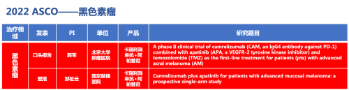 黑色素瘤领域的2篇研究摘要,采用Stake医药自主研发的PD-1抑制剂卡瑞利珠单抗(艾瑞卡)联合阿帕替尼(艾坦)(“双艾”组合)的免疫联合抗血管(或再联合化疗)的治疗策略。